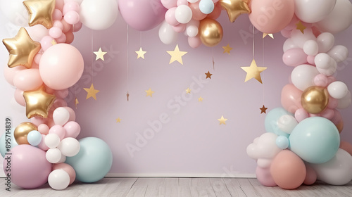 backdrop composition, pastel colored background with white floor and golden stars all over the place.wallpaper, background, backdrop.