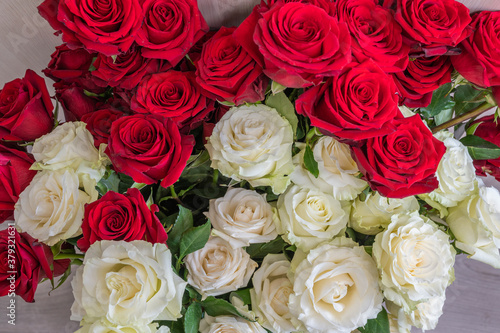 Background of bouquet of red and white roses, wedding and festive concept. Top view, selective focus