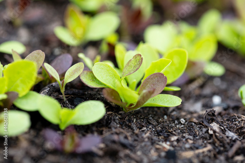 Background of fresh lettuce salad growth on the ground soil in the garden in spring season.