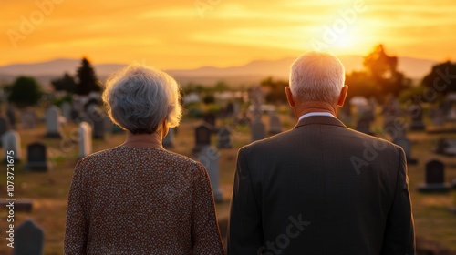 Backside view two elderly people standing in front of a cemetery. The sun is setting in the background. Scene is somber and reflective