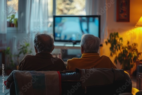 Backview of an elderly male gay couple sitting in the living room and watching TV together.