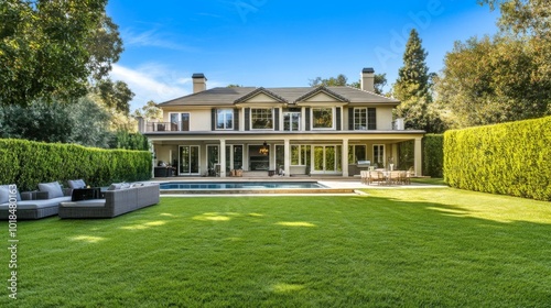 house, home, luxury home, residence, backyard, lawn, grass, green, tree, bush, hedge, pool, swimming, water, patio, deck, furniture, chair, table, grill, sky, cloud, blue, white, sunny, day, summer, landscape, exterior, architecture, luxury, lifestyle, relaxing, peaceful, serene, beautiful, living, space