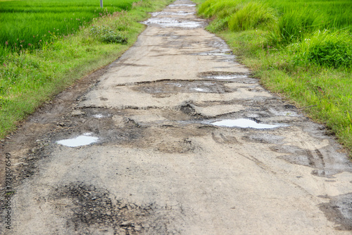 Badly damaged asphalt road with many holes and puddles with many holes and puddles