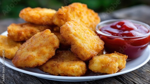 chicken, nugget, ketchup, plate, wooden, background, food, meal, snack, fast food, kitchen, dining, rustic, textured, unhealthy, fried, savoury, sauce, epicure, art, cooking, dining table, natural light, served, cookery, homemade, casual attire, comfort, crispy, gold, tasty, bite, eating, lunch, dinner, receipe, children, sharing, fun, enjoyment, plate, bright, colours, fried, simple