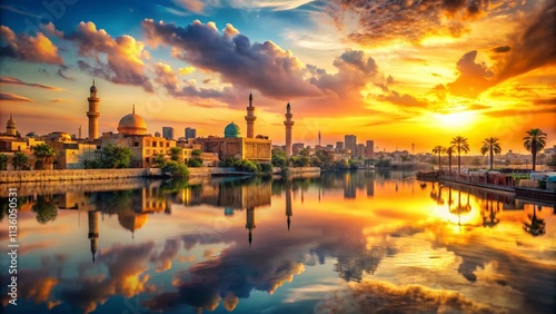 baghdad, river, double exposure, city landscape, sunset, surreal, dreamlike, architecture, irak, tigris, water, golden hour, city, urban, landscape, photo, artificial intelligence, digital artwork, abstract, modern art, mesopotamia, history, culture, travel, beauty, vibrant, flowing, detail, gold, warm, tone, light, shadow, texture, composition, artistic, creative, unique, original, fantastic, amazing, breathtaking, photorealistic, hi-res