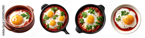 Baked eggs with tomato sauce and herbs served in different pans, delicious and colorful meal