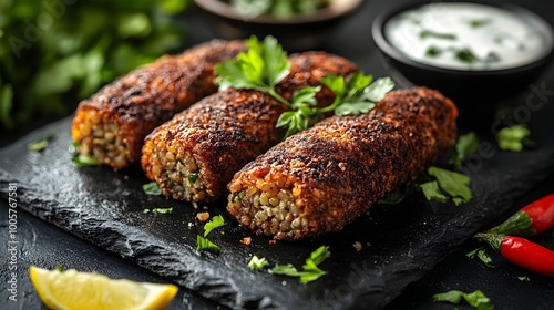 Baked Kebbeh Bil Sanieh Layers of Bulgur Ground Lamb and Spices with Yogurt Sauce on an Elegant Black Stone Plate