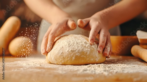 Baker Hands Kneading Dough with Flour on Wooden Table