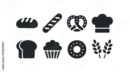 bakery, bread, icon, food, baking, pretzel, cupcake, wheat, chef, symbol, dough, pastry, bun, loaf, toast, harvest, grain, cooking, kitchen, sweet, design, graphic, vector, simple, collection