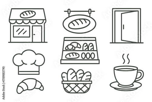 bakery, icon, set, bread, pastry, chef, hat, hot drink, cup, open, door, shop, signs, display, baguette, croissant, basket, steaming, beverage, entrance, outline, illustration, design, graphic, symbol, collection, epicure, food, drink, morning, breakfast, menu, cafes, fresh, culinary, kitchen, eatery, bake, good, delicious, meal, aroma, warmth, cosy, treat