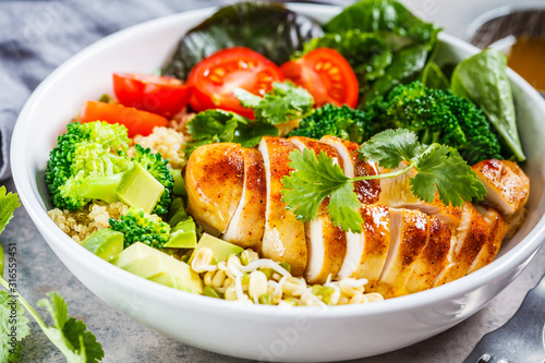 Balanced food concept. Chicken, broccoli and quinoa salad in white bowl, gray background.