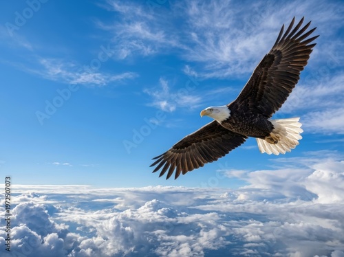 bald eagle, eagle, flying, soaring, blue skies, cloud, freedom, power, nature, wildlife, bird, conservation, outdoors, aviation, flight, feather, wing, majestic, serene, sky, cloudy, white, black, brown