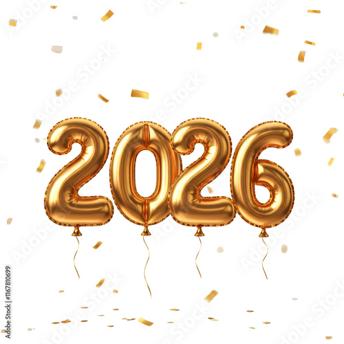 Balões dourados em formato de 2026 com papel picado dourados caindo isolado em fundo transparente