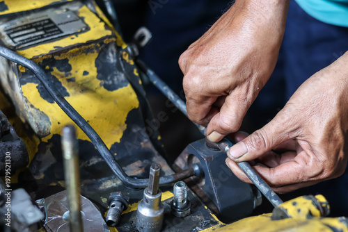 Balikpapan-Indonesia april 10, 2026, Close up hands of mechanic installing hydraulic tubing on transmission control valve of heavy equipment engine in workshop.