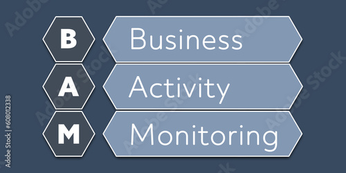 BAM Business Activity Monitoring. An Acronym Abbreviation of a term from the software industry. Illustration isolated on blue background
