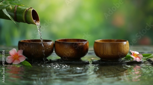 Bamboo Cup Tea Ceremony with Flowing Water and Flowers