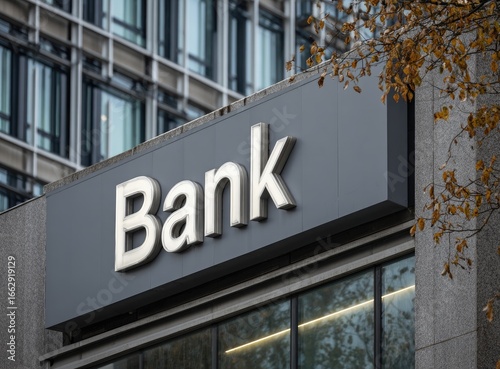 bank, signs, building, modern, exterior, facades, metal, letter, grey, window, daylight, autumn, leaf, urban, commercial, financial, establishment, business, commerce, address, signage, retail, office, corporate, steel, light, detail, perspective, closeup, architecture, city, urbanity, banking, finance, structure, investment, economy, modernism, contemporary, design