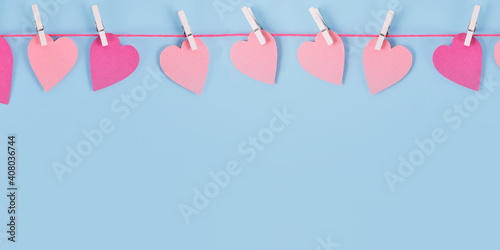Banner with Valentine'S Day pink paper hearts hanging from line with pegs with empy copy space on blue background