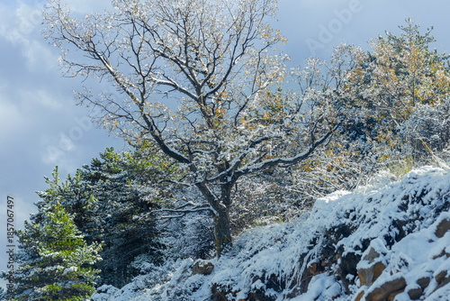 almería, spain, andalusia, snow, winter, tree, deciduous, yellow leaf, fog, mist, cold, december, seasonal, frost, contrast, white, green, brown, texture, outdoors, environment, mountain, landscape, rural, europa, ecology, scenic, quiet, solitude, atmospheric, cloudy sky, terrain, natural pattern, winter scene, transition, foliage, botanical