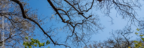 Bare tree branches against a clear blue sky signaling the onset of autumn, ideal for fall season or nature-themed backgrounds