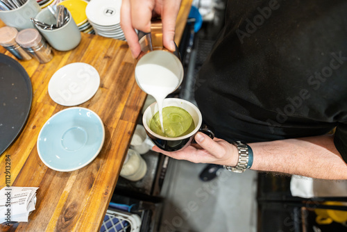 Barista pouring steamed milk into matcha green tea latte in cafe