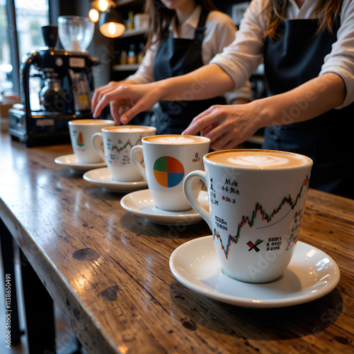 Baristas crafting lattes with creative designs in a modern coffee shop setting, photography of lifestyle concept.