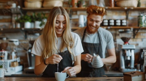 woman, man, business, smiling, together, professional, teamwork, happy, work, couple, hot drink, barista, drink, person, young, kitchen, service, milk, female, cafes, casual attire, equipment, people, apron, lifestyle, male, co-worker, cafes, partnership, job, eatery, friendly, occupation, making, employee, latte, shop, preparation, counter, pouring