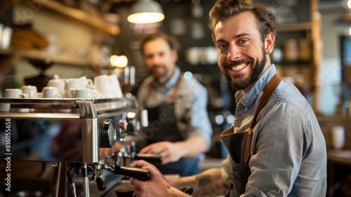 portrait, fashion, hot drink, happiness, barista, professional, man, cup, cafes, cafes, team, service, style, espresso, modern, joy, cafeteria, occupation, photogenic, work, machine, workplace, adult, beverage, drink, apron, casual attire, urban, hospitality, indoor, bar, cheerful, trendy, cafes, manual, friendly, employment, job, latte, preparation, recreation, craft, artisanal, partner