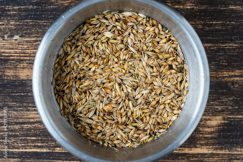 Barley grains for washing in water in a metal bowl on wooden table