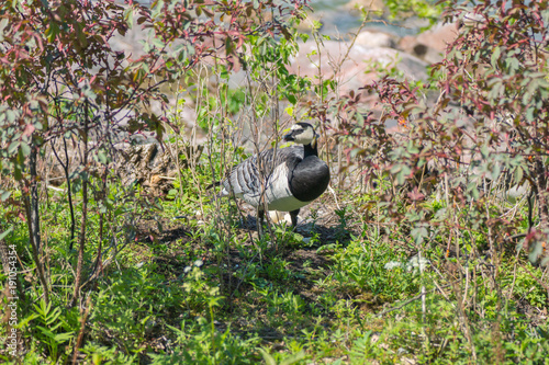 Barnacle Goose bird protects the nest with eggs located on the seashore in southern Finland