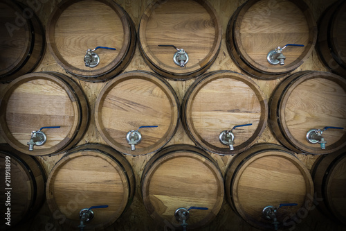 Barrels for the sale of beer and wine in the bar, background with vignette and copy space