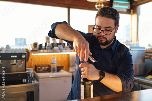 barkeeper, opening, bottle, wine, cafes, 1, people, adult, business, man, portugal, day, occupation, job, casual attire, alcohol, drink, bar, counter, refreshment, goggles, corkscrew, young, eatery, caucasian, preparation, male