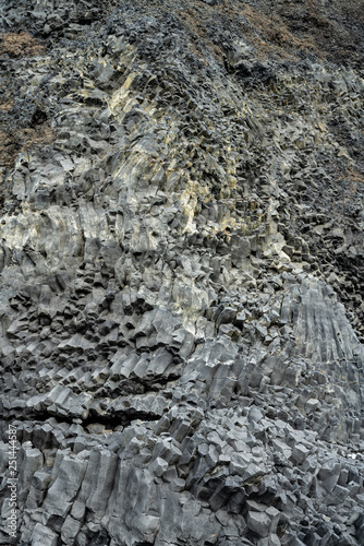 Basalt volcanic rock formations in Reinisfjara beach near Vik in northern Iceland