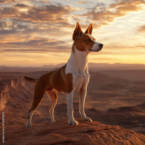 Basenji standing on a red rock cliff in the desert, warm sunset hues, dramatic and striking, UHD 8K