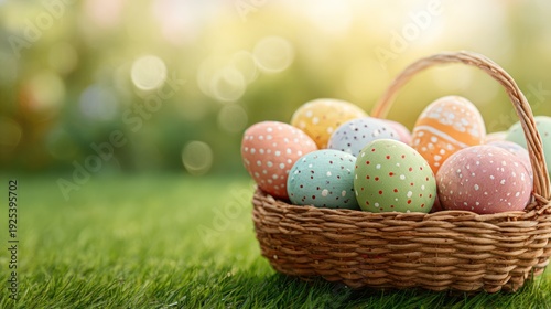 Basket of colorful Easter eggs on a grassy lawn with a blurred background.