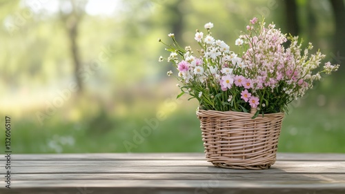 basket, wildflower, pink, white, outdoors, flower, arrangement, rustic, wooden, table, nature, garden, greenery, spring, summer, floral, natural, blossom, bloom, delicate, bouquet, wicker, fresh, meadow, serene, tranquil, background, countryside, flower petals, leaf, colourful, beauty, decoration, scenic, peaceful, lush, vase, composition, sunlight, relaxation, charming, plant, botany, environment, landscape