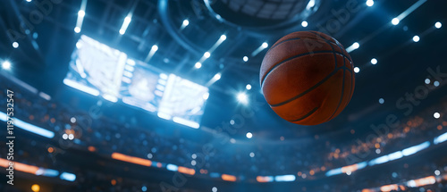 Basketball ball in focus before a large modern arena with a dramatic atmosphere -