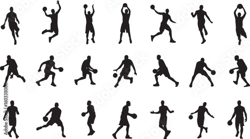 basketball, player, silhouette, black, white, action, sport, dribbling, shooting, jumping, running, passing, silhouette, vector, people, illustration, woman, man, ball, football, dance, fitness, player, tennis, run, soccer, runner, body, outline, set, icon