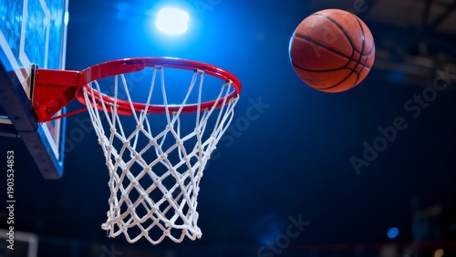basketball, hoop, net, rim, ball, sport, game, competition, score, action, motion, indoor, arena, court, professional, athlete, training, practice, lighting, dark, blue, orange, rebound, goal, success, sharpened, precision, athletic, closeup, detail, equipment, fitness, league, match, throw, shot, swish, leather, nylon, nobody