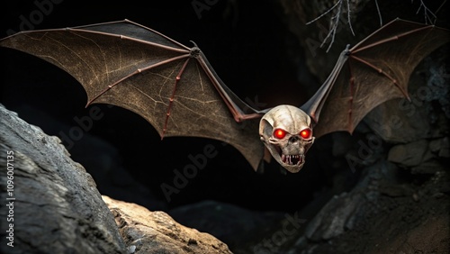 Bat skull with glowing red eyes in a dark cave background, dark cave, haunted landscape