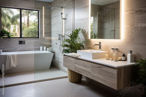 bathroom, interior, bathtub, window, shower, vanity, sink, privies, mirror, plant, basket, towel, soap, amenity, luxury, modern, roomy, bright, natural light, white, beige, brown, wood, stone, tile, glasses, chrome, fixture, plumbing, architecture