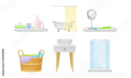 Bathroom Items with Pieces of Furniture and Lavatory Equipment Vector Set