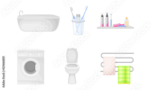Bathroom Items with Pieces of Furniture and Lavatory Equipment Vector Set