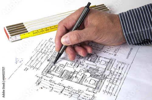 concept, hand, pin, drawing, blueprint, architect, static, folding rule, house, home, new construction, broker, solicitor, credit, bench, account, interest, real estate