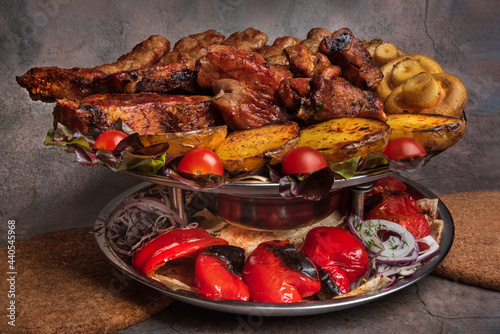 BBQ meat and vegetables. Meat still life. Grilled meat and vegetables. Beef with vegetables.