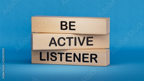 Be active listener symbol. Wooden blocks with words Be active listener.Business and active listening concept.Copy space.3D rendering on blue background.
