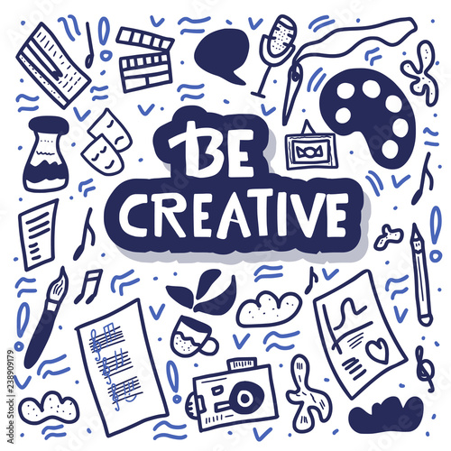 be, creative, art, trend, lettering, word, quote, element, signs, phrase, inscription, letter, motto, signs, message, handwritten, brush, ink, dry, text, doodle, style, vignetting, cartoon, childish, drawing, flier, card, banner, template, poster, booklet, invitation, greeting, advertising, badge, tags, label, emblem, advertisement, promotion, sticker, blue, white, background, camera