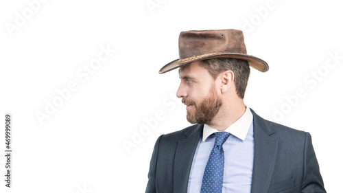 manager, director, man, professional, businessman, cowboy hat, lawyer, ceo, employer, boss, broker, employee, expert, male, serious, emotion, profile, portrait, formal, suit, isolated on white, copy space