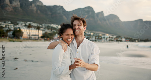 Beach, happy interracial couple and holding hands for love, trust and healthy relationship. Seashore, man and woman hug outdoor for summer holiday, travel and romantic date with partner for support