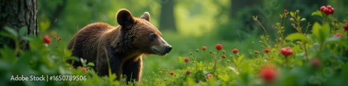 Bear snout amidst berry patches, green undergrowth, dense foliage, berries